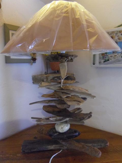 Lampe abat jour caramel / bois et galets récoltés sur nos plages d'Oléron. prix de vente à l'atelier
