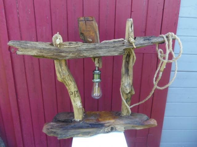 Lampe originale en bois flotté récolté sur nos plages d'Oléron avec ampoule suspendue. Prix de vente à l'atelier