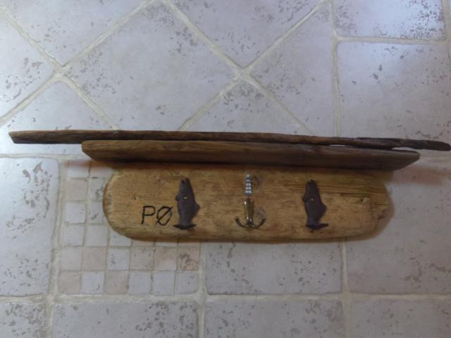 Porte manteau 2 patères + 1petit double 1 étagère au dessus de 13 cm de large en bois flotté récolté sur nos plages d'Oléron. Prix de vente à l'atelier